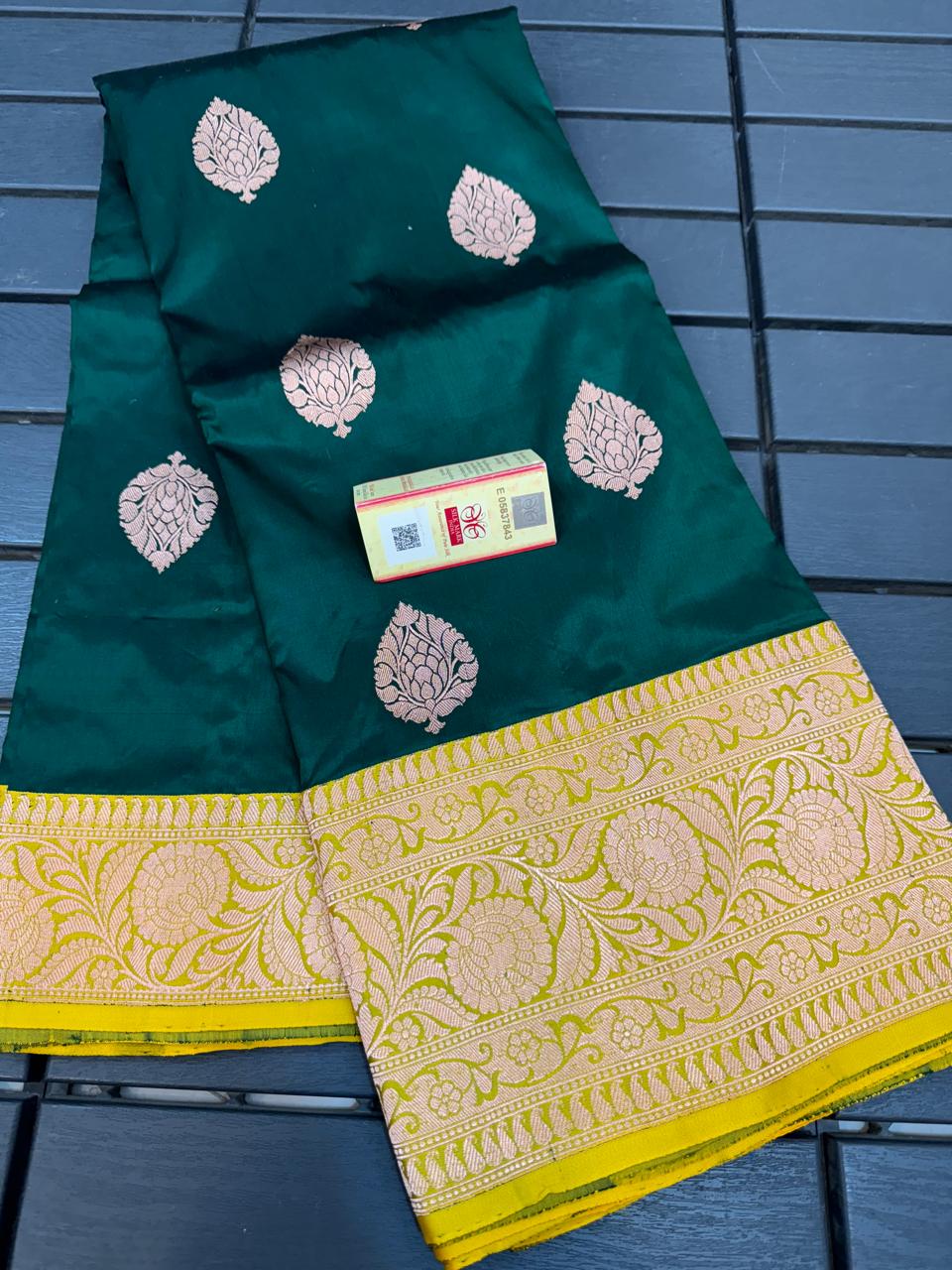 Gorgeous Green color pure katan silk Banarasi saree with contrast border and pallu. The saree has meenakari gold zari floral boota all over. The saree looks stunning and captivating on the drape. The fabric has a soft feel....