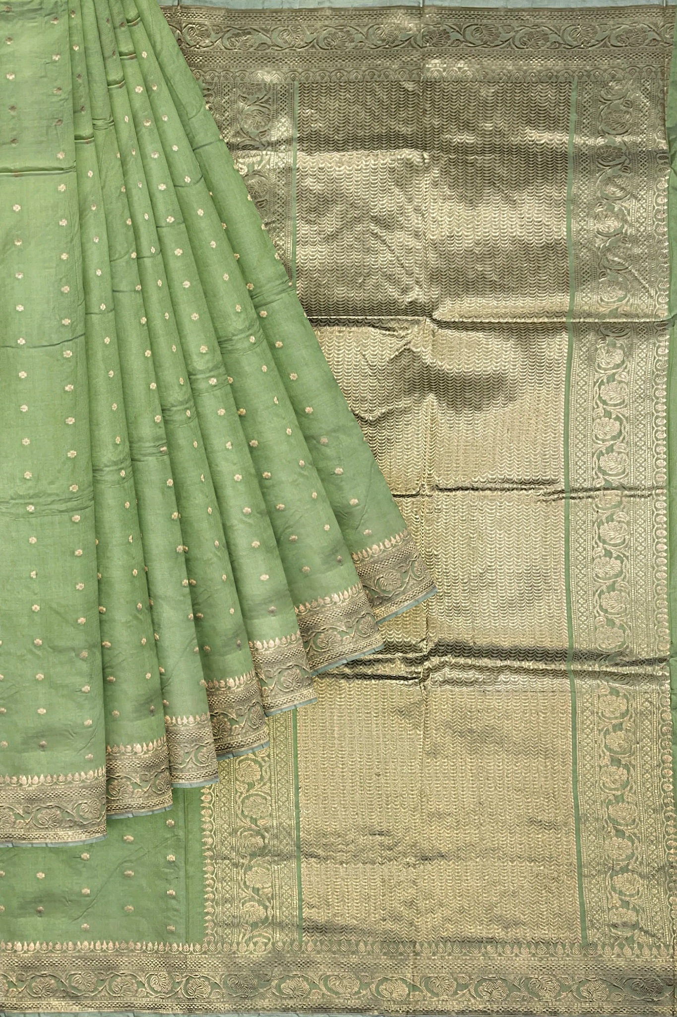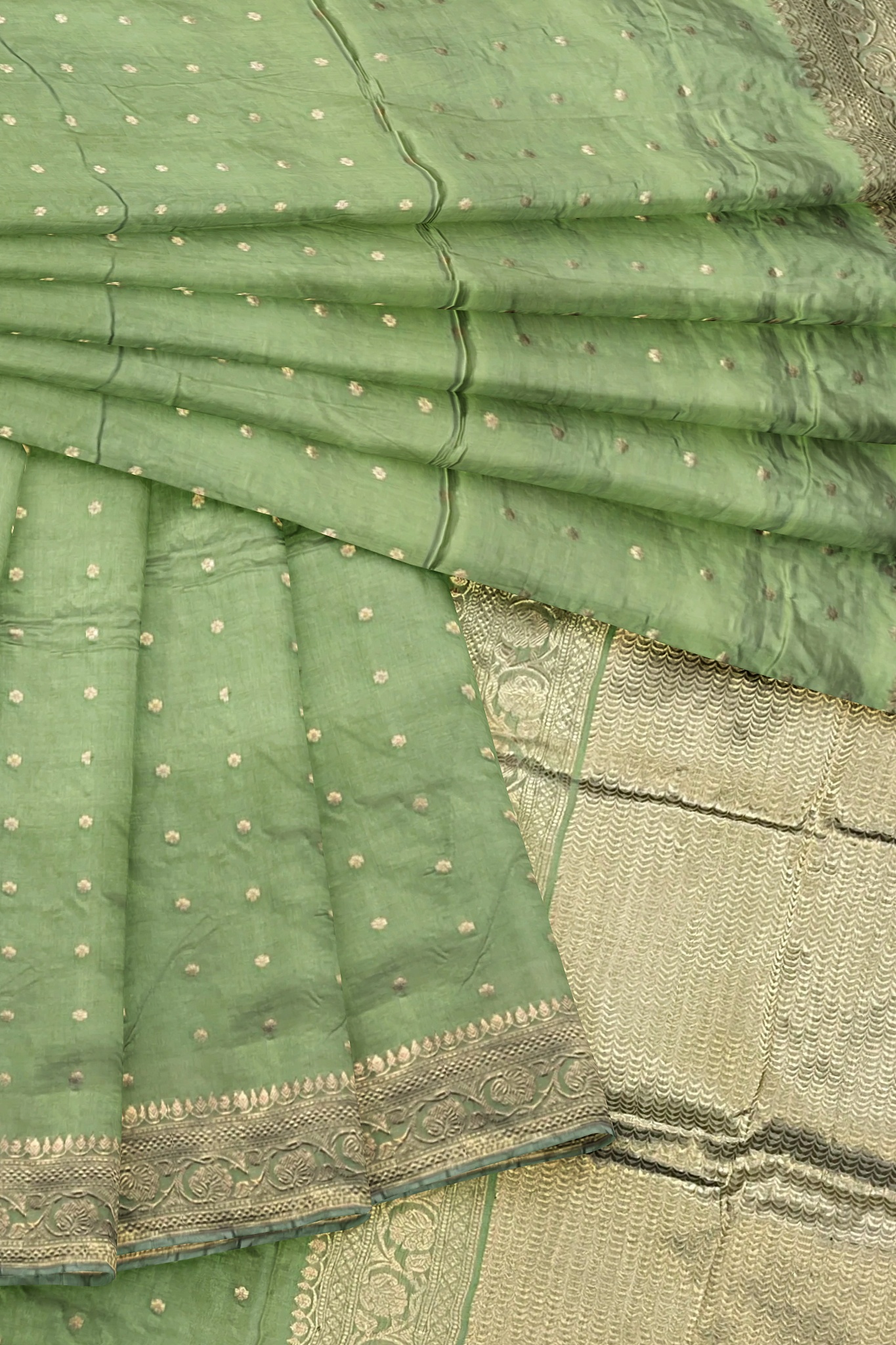 Gorgeous Green color pure katan silk Banarasi saree with border and pallu. The saree has gold zari floral Booti all over. The saree looks stunning and captivating on the drape. The fabric has a soft feel....