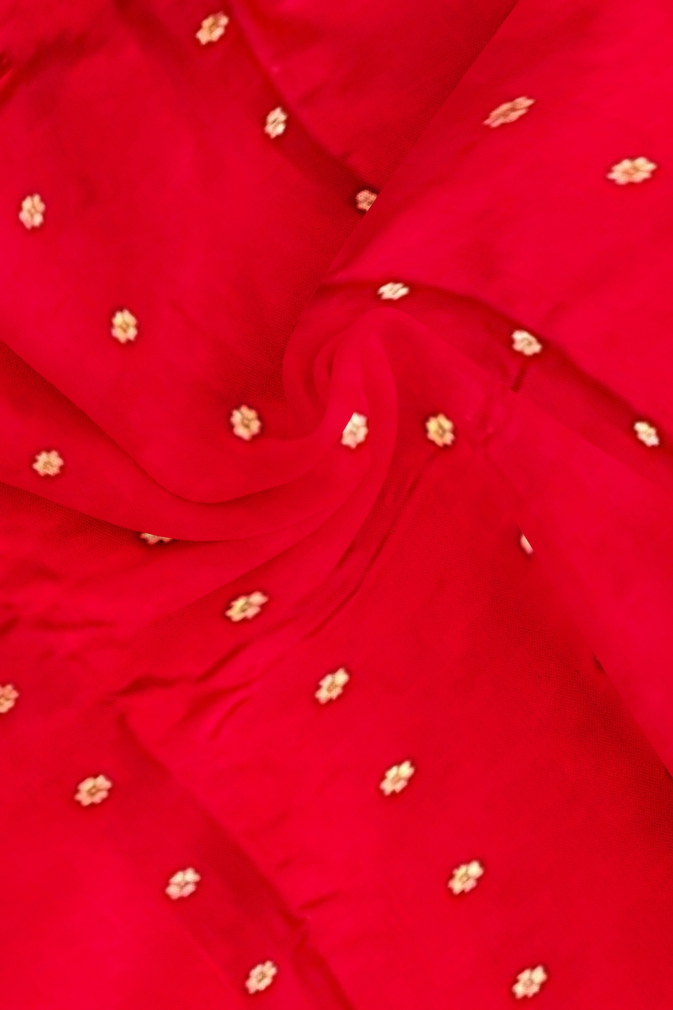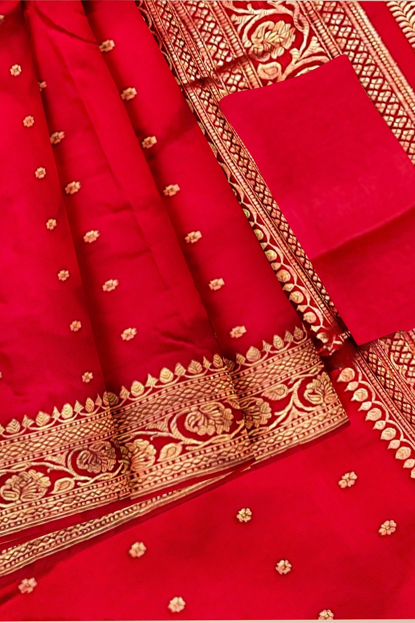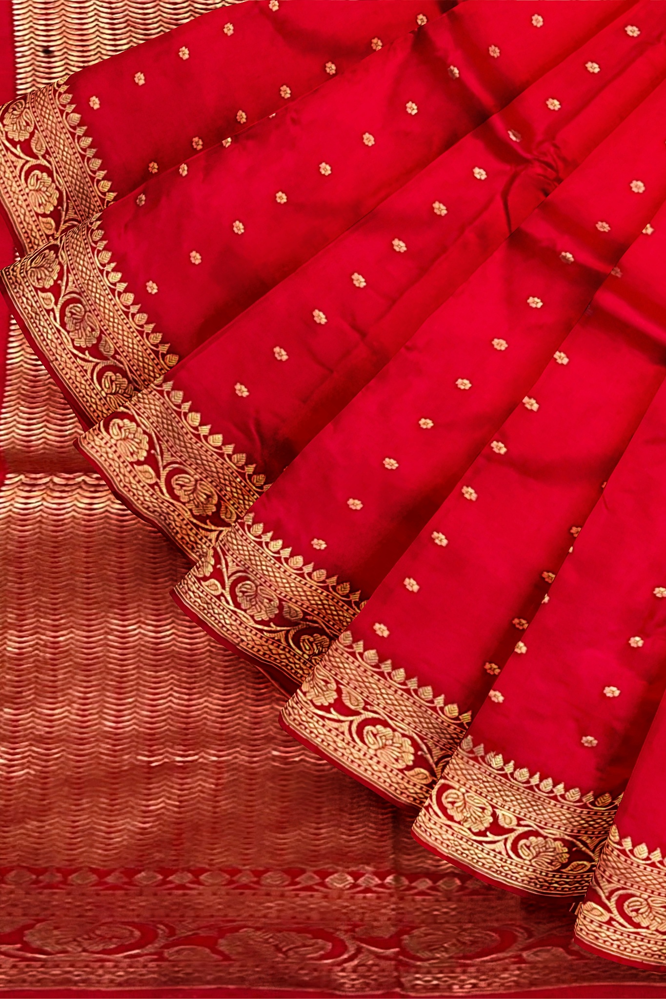 Gorgeous Red color pure katan silk Banarasi saree with border and pallu. The saree has gold zari floral Booti all over. The saree looks stunning and captivating on the drape. The fabric has a soft feel....