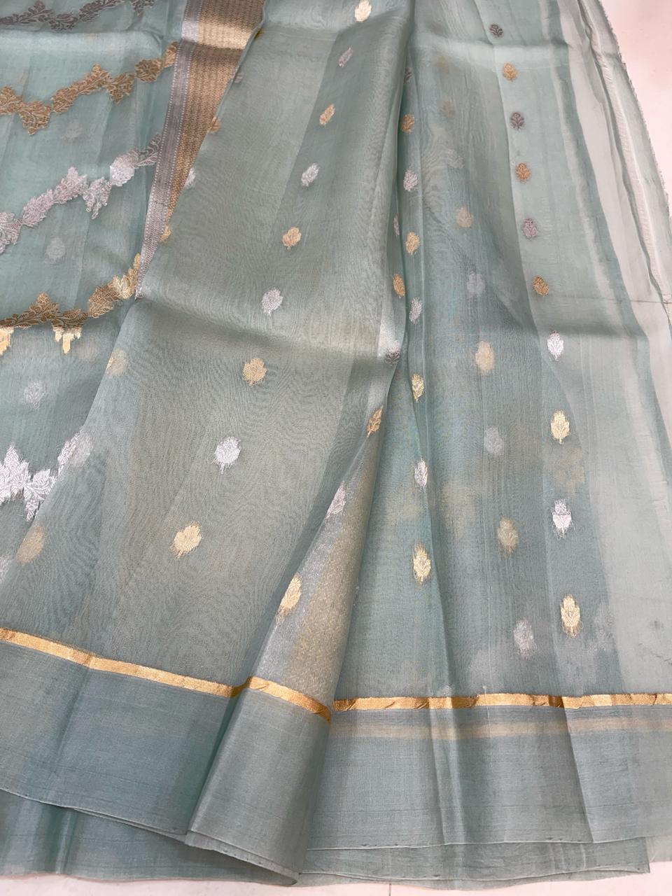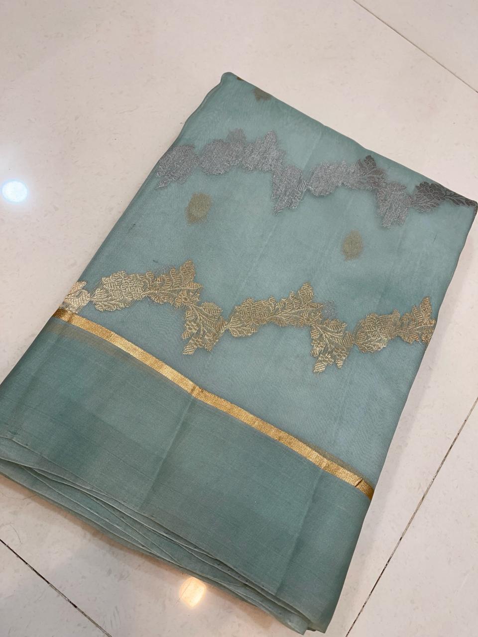 Embark on an exquisite journey with our Grey Organza Saree. This lightweight and sheer masterpiece effortlessly combines traditional craftsmanship with modern allure. Adorned with intricate zari work and vibrant motifs, this saree narrates a unique story