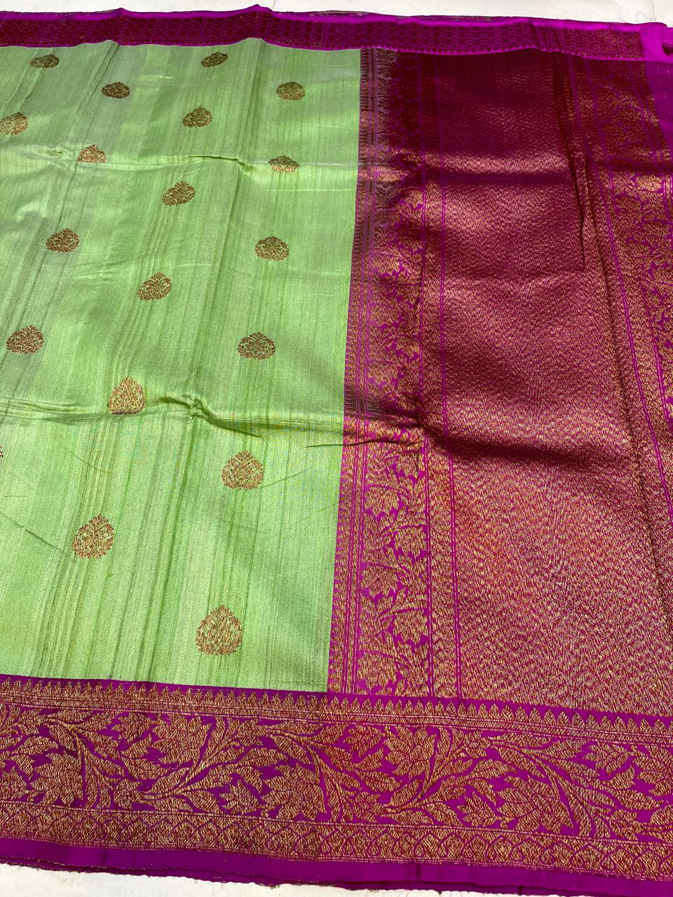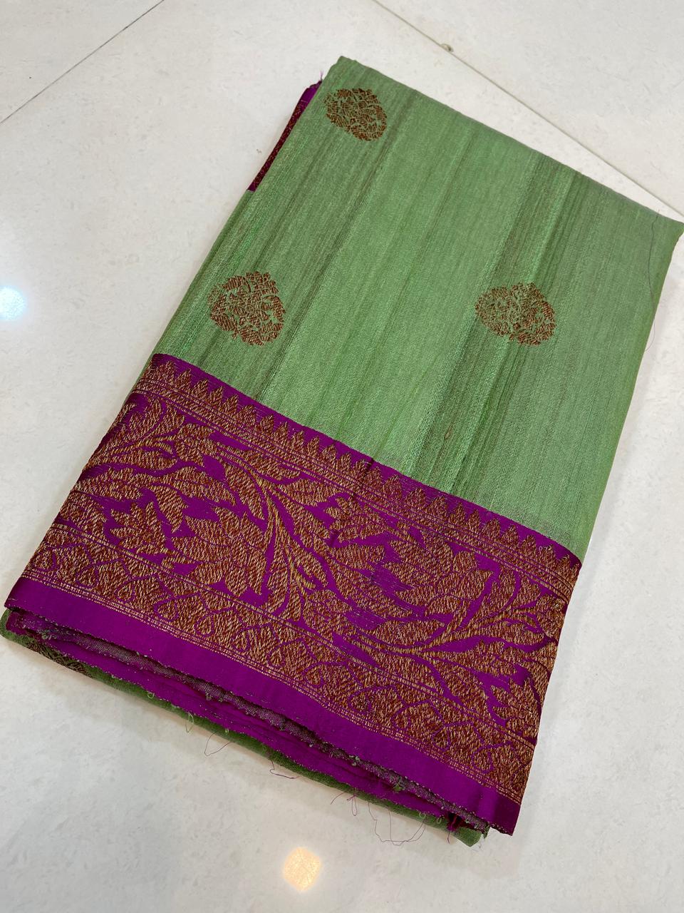 Introducing our Banarsi Tussar Saree in a mesmerizing shade of Green. This exquisite ensemble captures the essence of traditional Banarasi weaving, adorned with intricate zari work and timeless motifs. The Tussar silk adds a touch of luxury to the lightwe