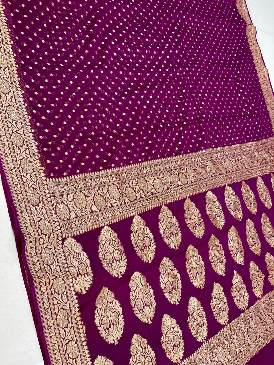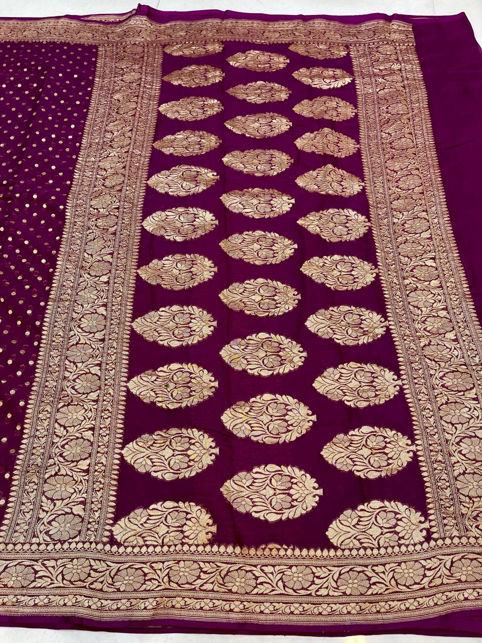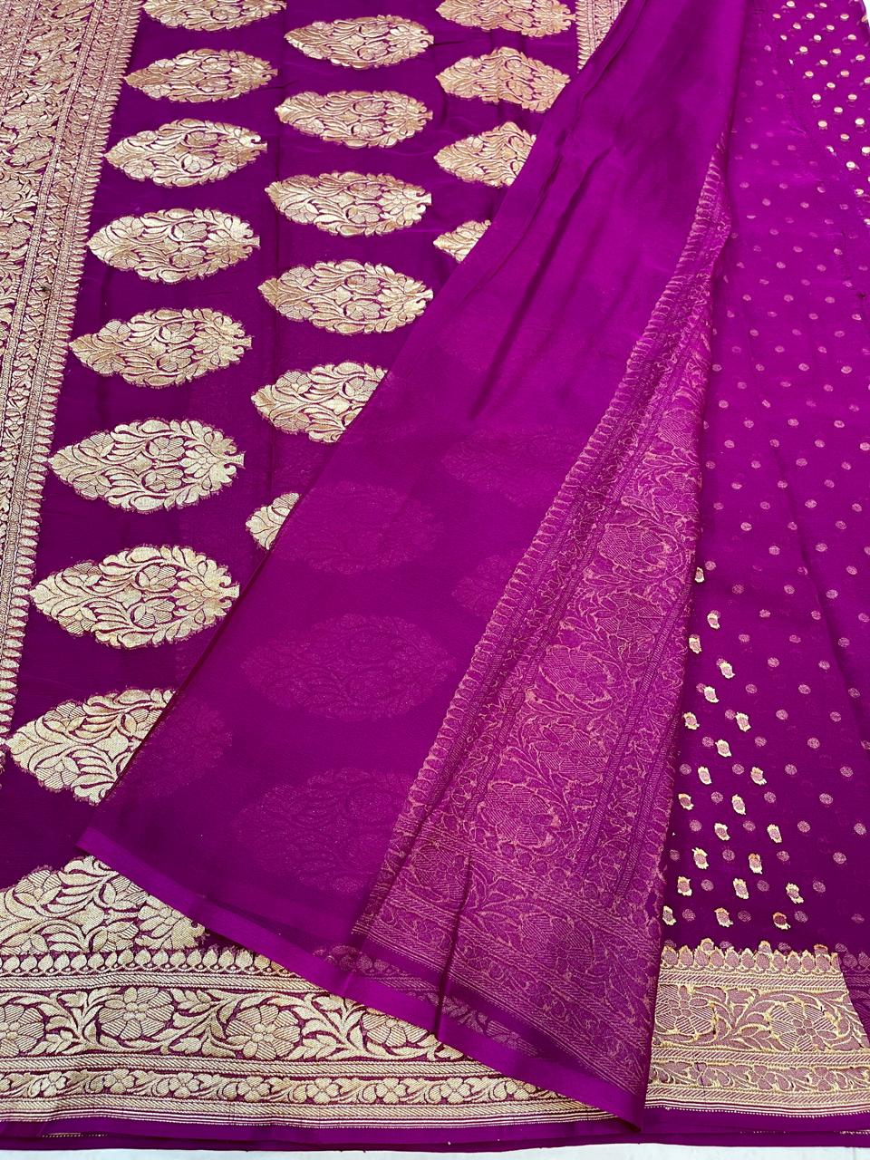 Presenting our Banarasi Khaddi Georgette Saree in a stunning shade of Mulberry. This exquisite ensemble seamlessly weaves the traditional essence of Banarasi craftsmanship with the lightweight allure of Khaddi Georgette. Adorned with intricate zari work a