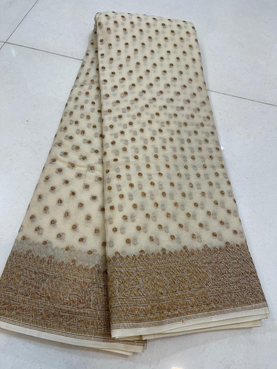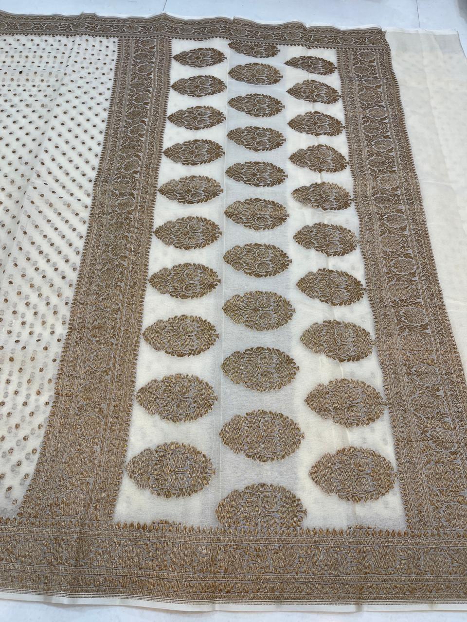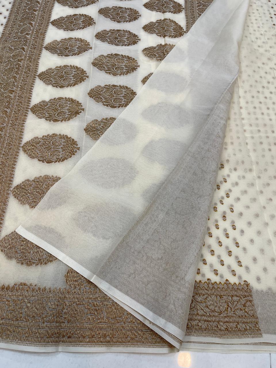 Presenting our Banarasi Khaddi Georgette Saree in a stunning shade of White. This exquisite ensemble seamlessly weaves the traditional essence of Banarasi craftsmanship with the lightweight allure of Khaddi Georgette. Adorned with intricate zari work and