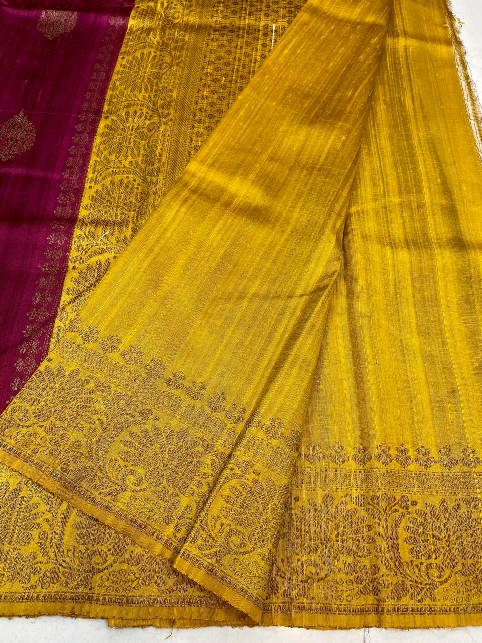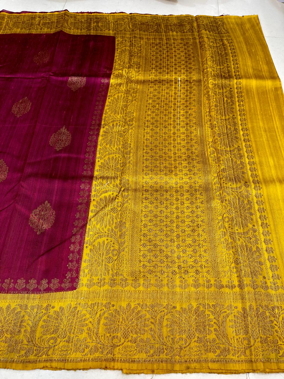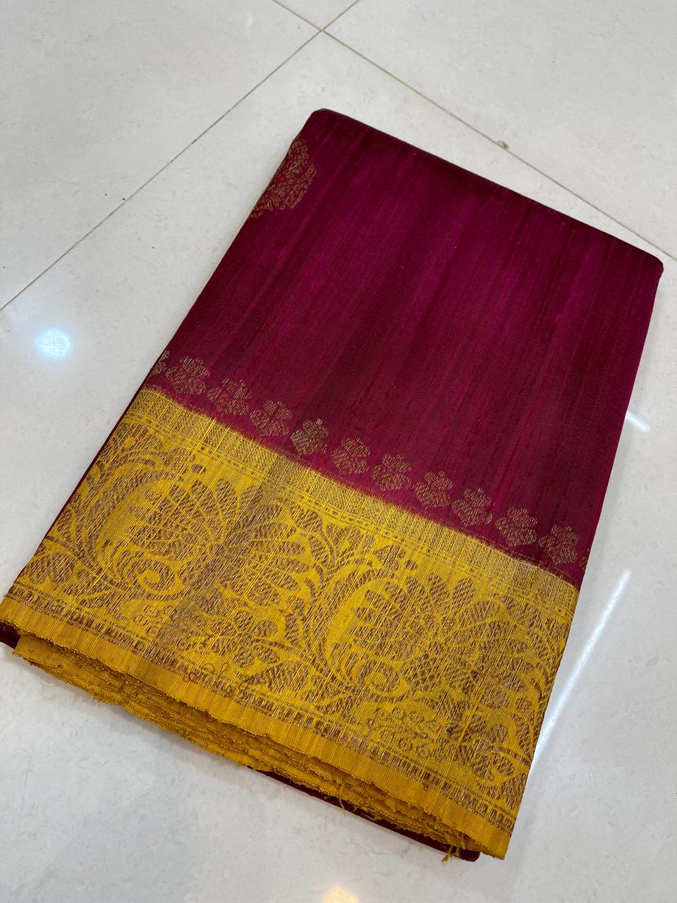 Introducing our Raw Silk Saree in a sophisticated Magenta. This exquisite ensemble seamlessly marries the timeless allure of traditional Raw Silk with modern elegance. Adorned with intricate thread work and delicate motifs, the luxurious texture of Raw Si