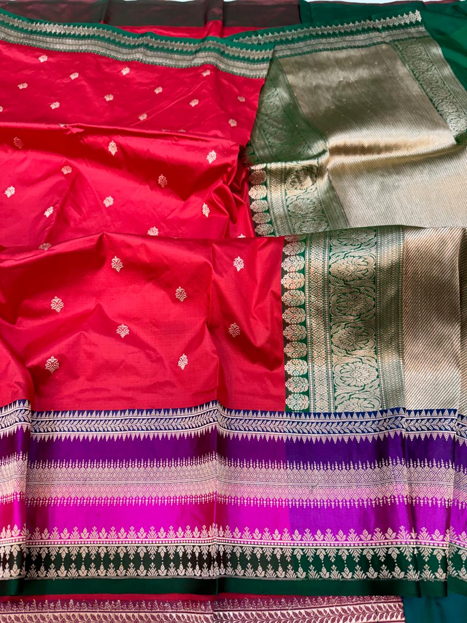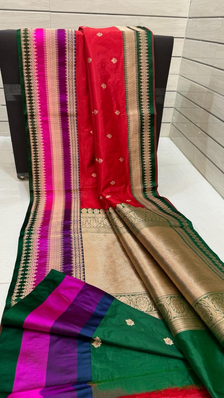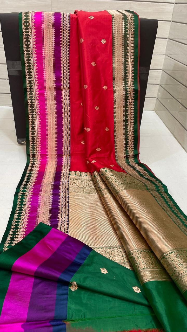 Gorgeous Red color pure katan silk Banarasi saree with contrast border and pallu. The saree has meenakari gold zari floral boota all over. The saree looks stunning and captivating on the drape. The fabric has a soft feel....